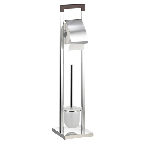 Стойка для туалета. Комплект: держатель туалетной бумаги с крышкой и щетка для унитаза. Произведено из хромированной стали с деревянными вставками