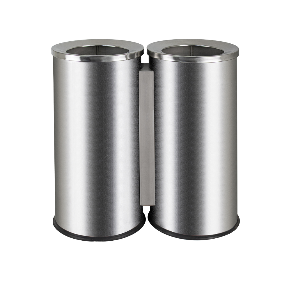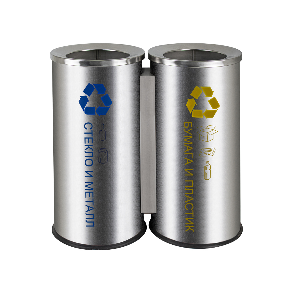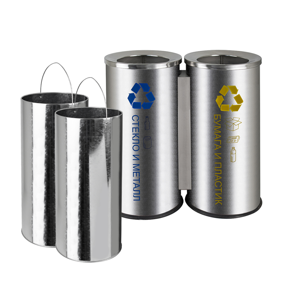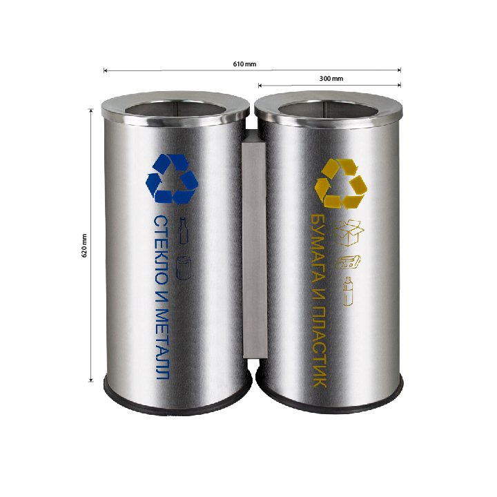 Урна для раздельного сбора мусора – 2 секции, оснащена оцинкованным гигиеническим контейнером – 2 шт, с металлической ручкой для переноса. Отличное решение для утилизации мелкого бытового мусора, изготовлено из устойчивой к коррозии, из нержавеющей стали марки SUS 410. Толщина металла 0,7 мм, объем 100 л. Габаритный размер: высота 620 мм, ширина 610 мм, диаметр одного отсека 300 мм. Нескользящая пластиковая основа ведра предотвращает повреждение пола. Вес – 11,800 кг, объём – 0,17000 м3.