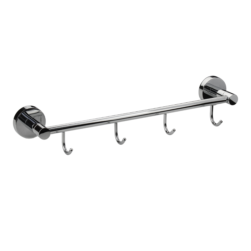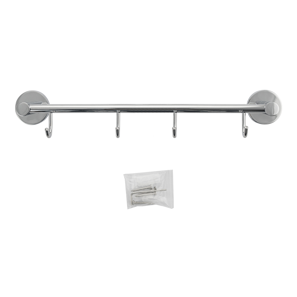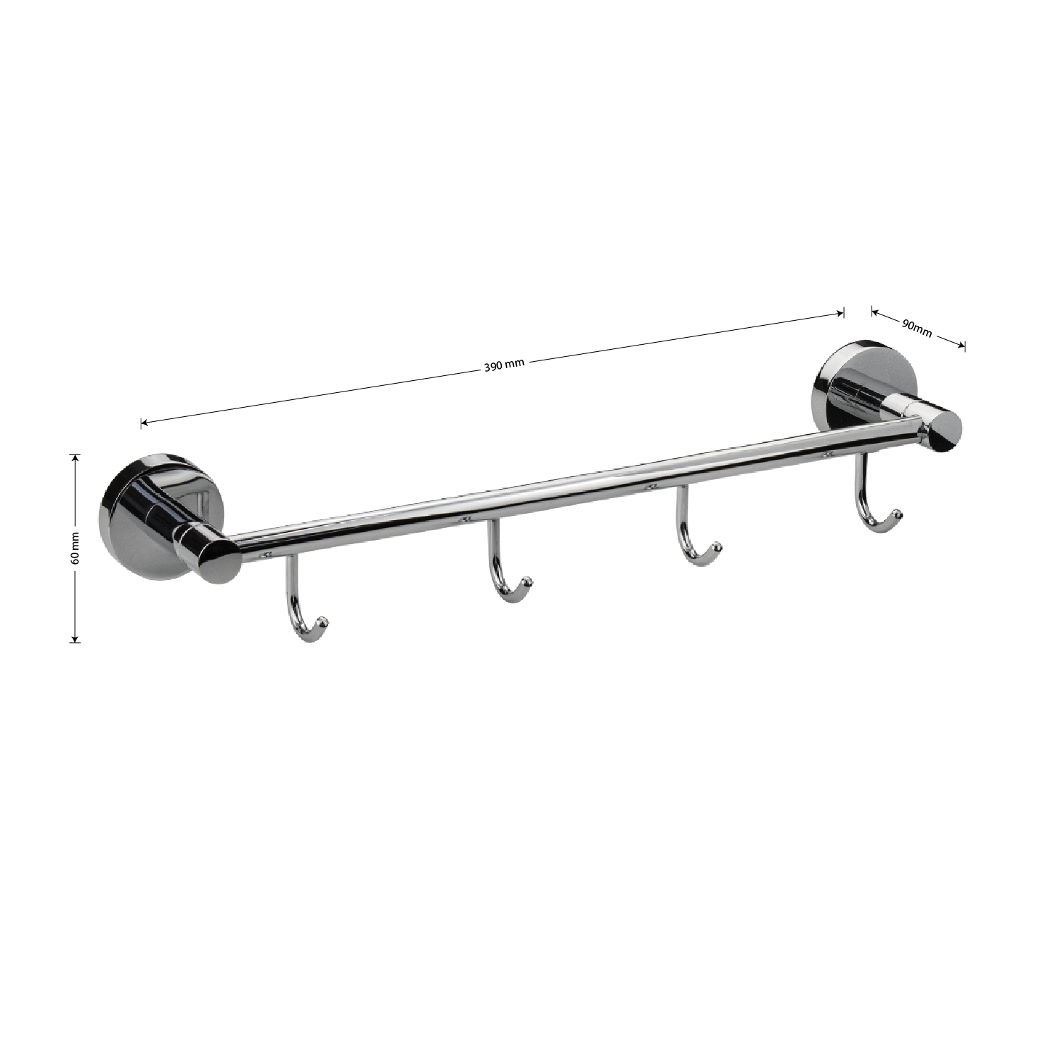 Держатель для полотенец металлический, хромированный, с четырьмя крючками. Материал изготовления — нержавеющая сталь. Хромированное покрытие очень стойко переносит истирания и обеспечивает зеркальный блеск изделия. На держателе с легкостью можно размещать вещи для сушки или вешать, как полотенца, так и одежду перед походом в душ. Идеально подойдет не только для ванной, но и для кухни, а также для дачи или гаража – при необходимости на держатель можно вешать любые предметы. Изделие крепится к стене с помощью дюбелей и саморезов (входят в комплект). Габаритные размеры: длина 390 мм, высота 60 мм, глубина 90 мм, диаметр посадочного седла 50 мм. Вес – 0.45 кг, объём – 0.00288 м3.