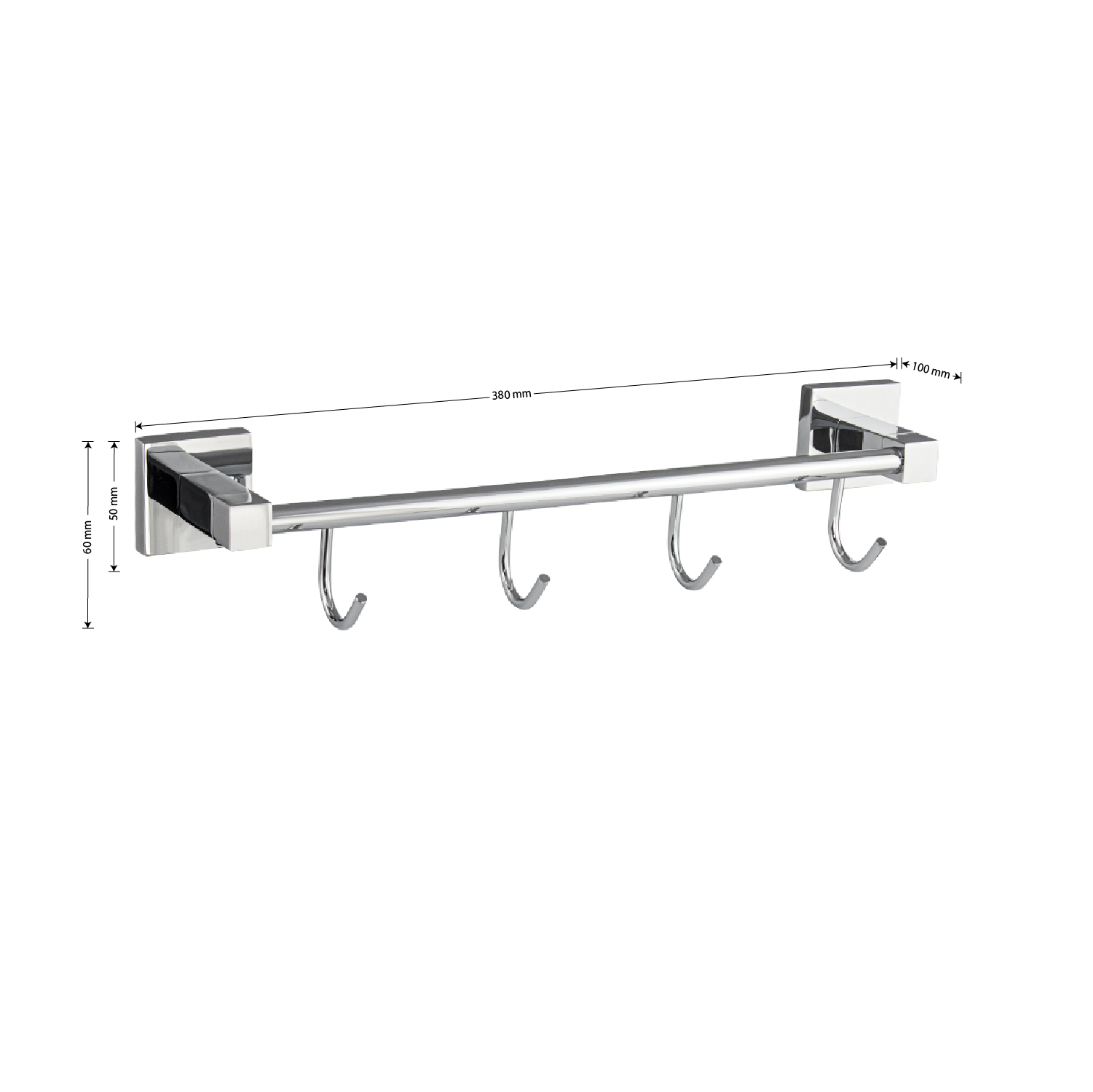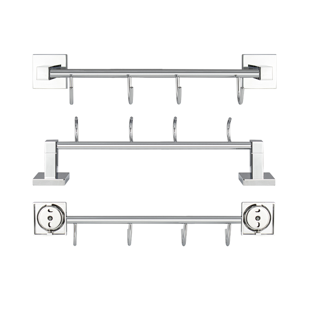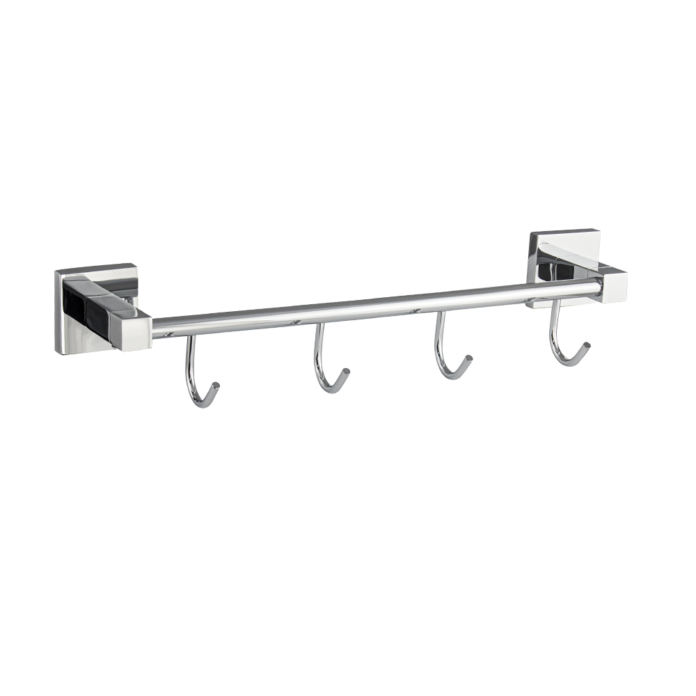 Держатель для полотенец металлический, хромированный, с четырьмя крючками. Материал изготовления — ЦАМ (цинк-алюминий-медь) + нержавеющая сталь. Хромированное покрытие очень стойко переносит истирания и обеспечивает зеркальный блеск изделия. На держателе с легкостью можно размещать вещи для сушки или вешать, как полотенца, так и одежду перед походом в душ. Идеально подойдет не только для ванной, но и для кухни, а также для дачи или гаража – при необходимости на держатель можно вешать любые предметы. Изделие крепится к стене с помощью дюбелей и саморезов (входят в комплект). Габаритные размеры: длина 380 мм, высота 60 мм, глубина 100 мм, основание 50*50 мм