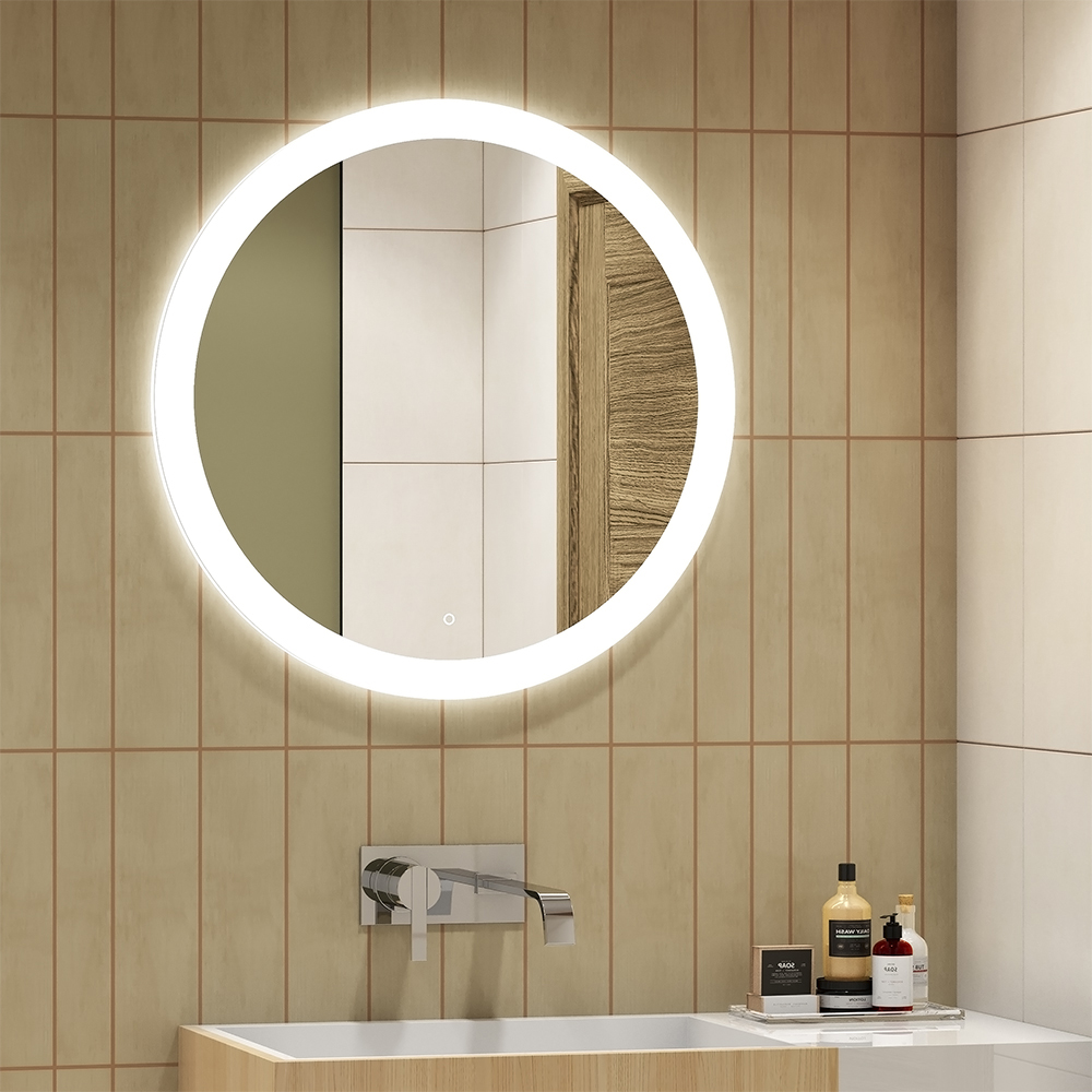 Зеркало с внутренней LED подсветкой, круглое, сенсорное, с пескоструйным орнаментом изготовлено из влагостойкого зеркального полотна толщиной 4 мм производства AGC GLASS EUROPE. Корпус изготовлен из высокопрочного пластика АБС. Источник света скрыт за зеркальной поверхностью, световое зеркало представляет собой идеальное сочетание стеклянной поверхности и глубокой игры света. Край полотна обработан для защиты от порезов при контакте. Питание от сети 220В, сенсорный выключатель, температура свечения LED – 6000К, светодиоды – 2835 (120), 220 V / 50 Hz. Управление подсветкой осуществляется сенсорным выключателем. Срок службы диодов – 30000 часов. LED подсветка зеркала имеет нейтральный оттенок белого свечения. Изделие прошло обязательную сертификацию и может использоваться в помещениях с повышенной влажностью воздуха. В комплект поставки входит крепеж. Габаритные размеры: диаметр – 645 мм. Вес – 4,700 кг