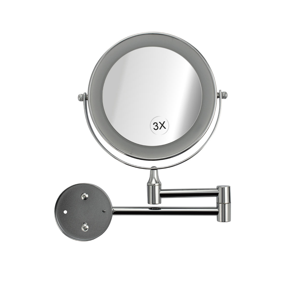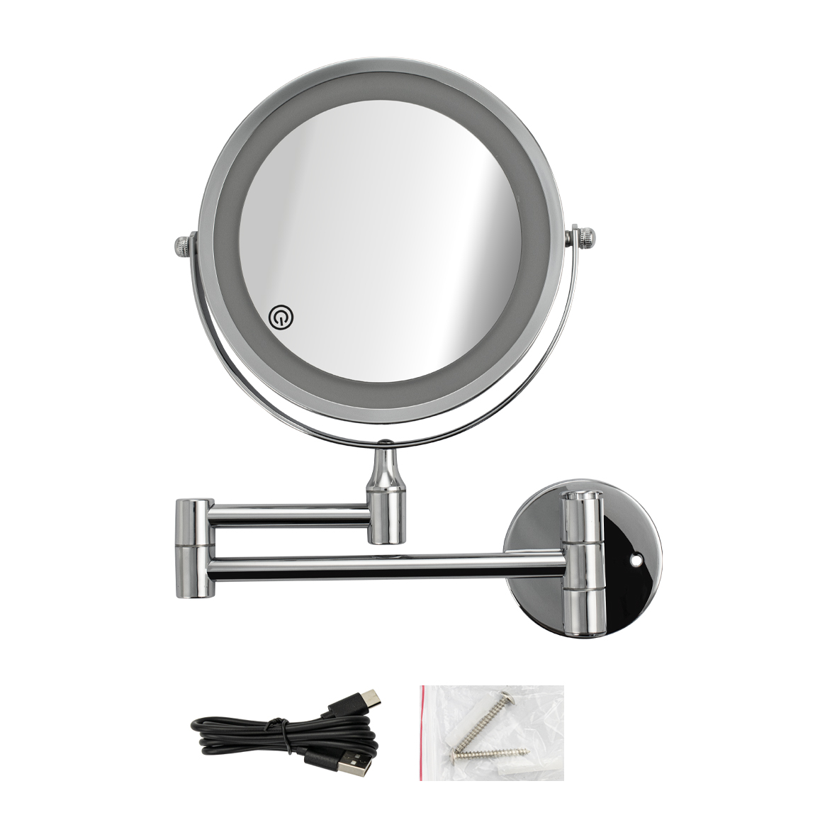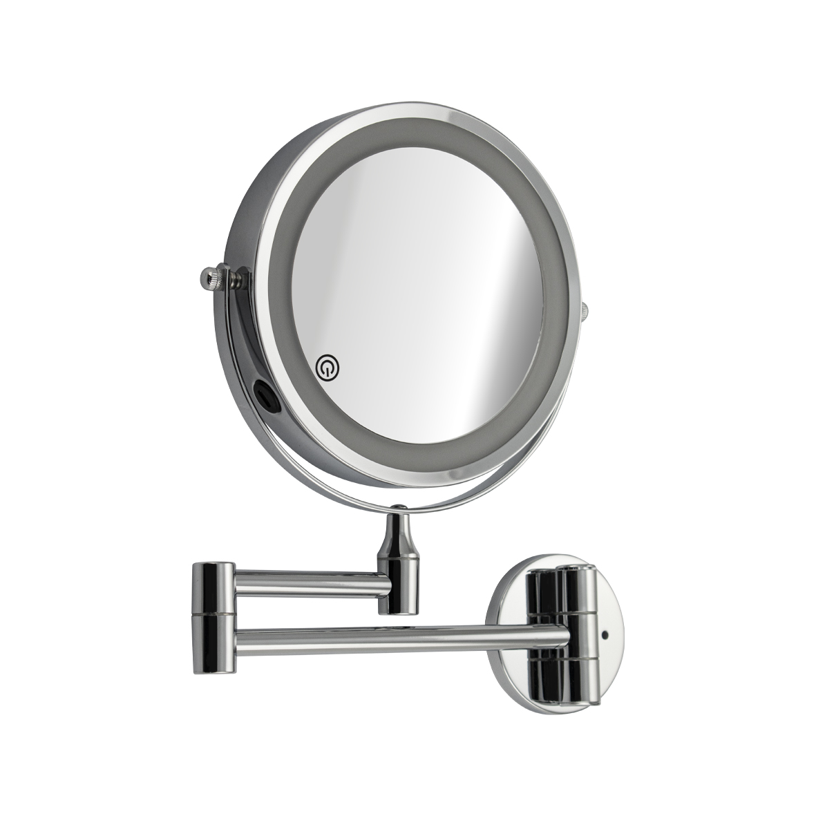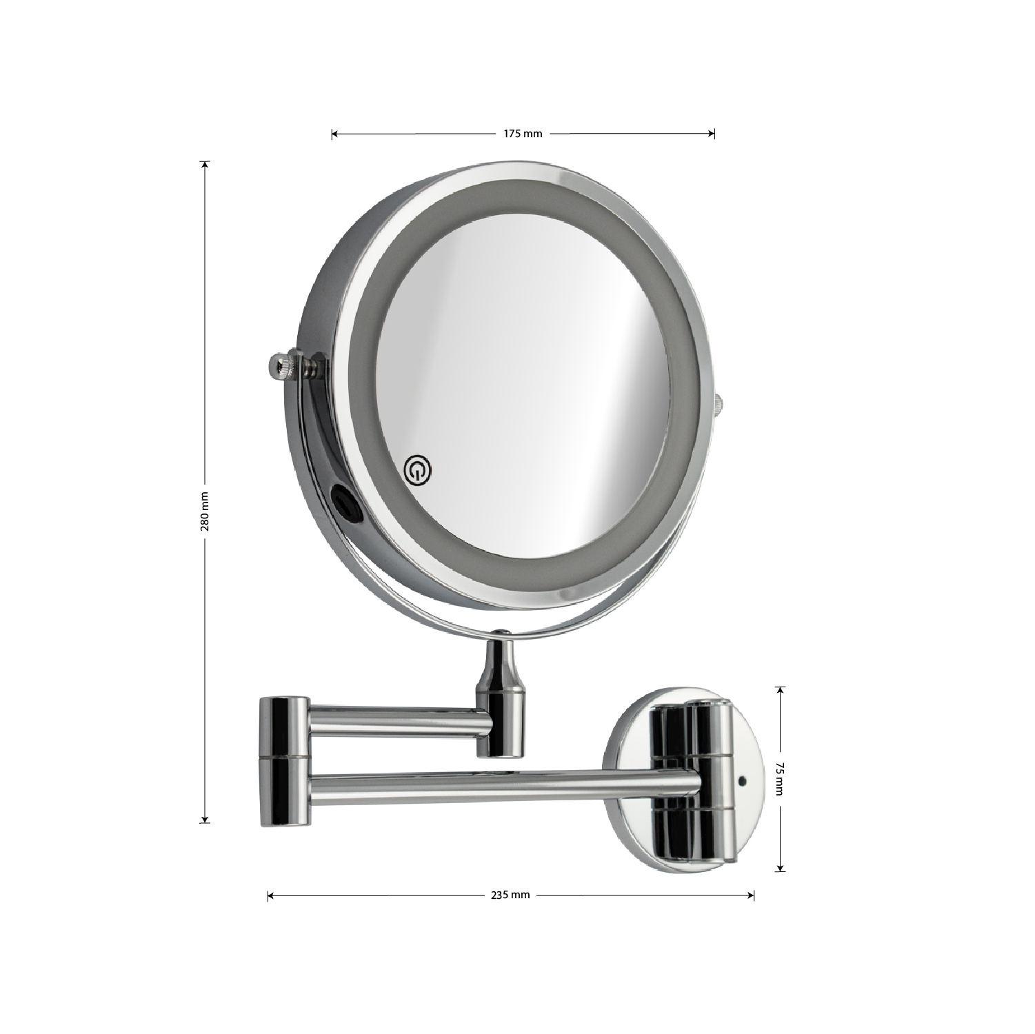 Зеркало косметическое, настенное, с LED подсветкой, сенсорное включение, зарядка Type – C, шнур в комплекте, корпус из нержавеющей стали, цвет хромированный. Габаритные размеры: высота 280 мм, длина 235 мм, диаметр зеркала 175 мм, диаметр посадочного седла 75 мм.